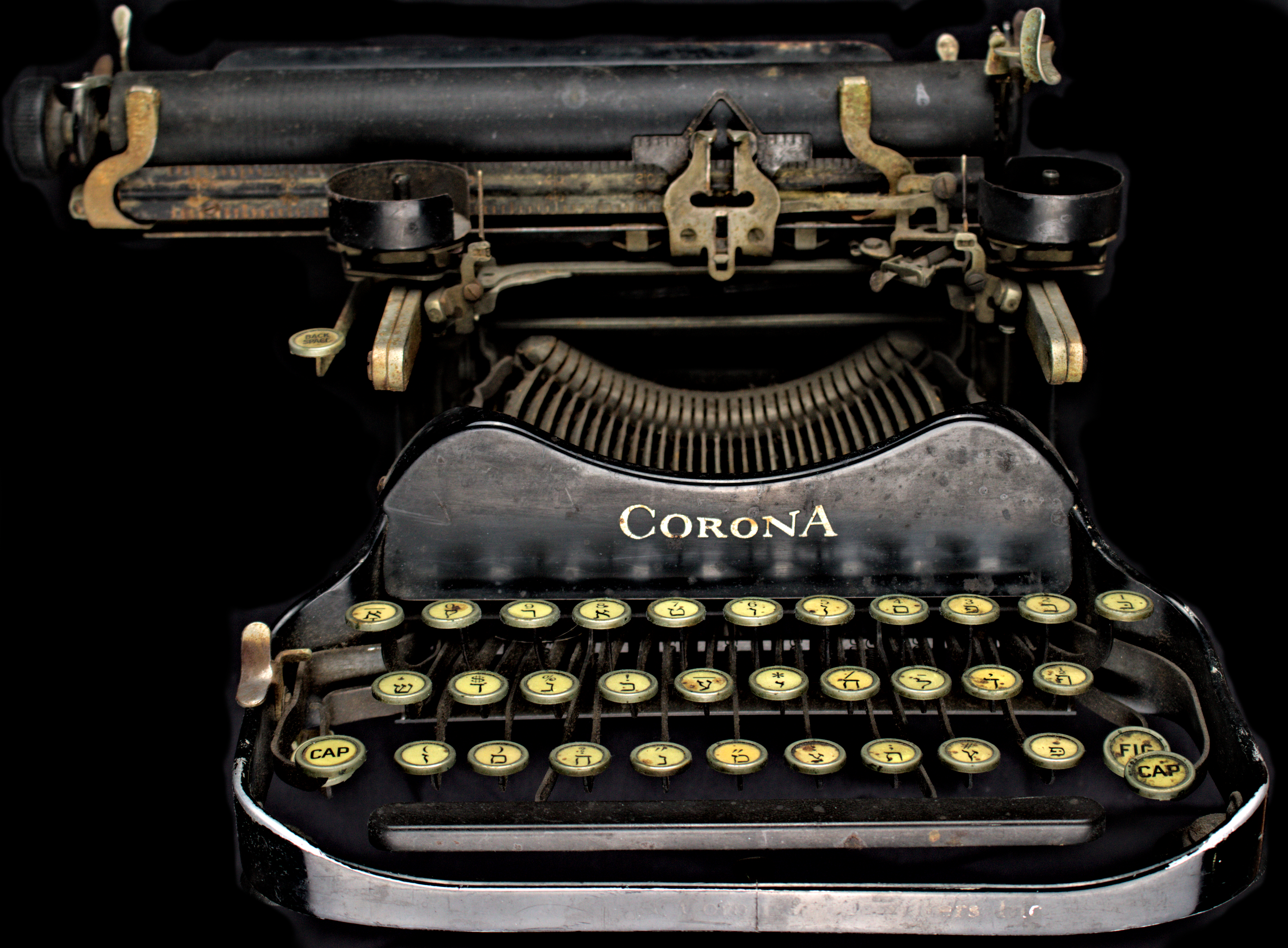 Perhaps as a consequence of its compact size, the Corona XC-R featured a modified Yiddish keyboard, capable of typing both Hebrew and Yiddish but missing several keys common to other Yiddish layouts. The inclusion of the komets aleph, in the upper left corner, indicates the machine was meant for Yiddish. The omission of the double letters could be overcome by simply typing the yod and vov multiple times. Unlike some earlier typewriters, the XC-R included three characters on each key, with CAP and FIG keys to shift the carriage up.