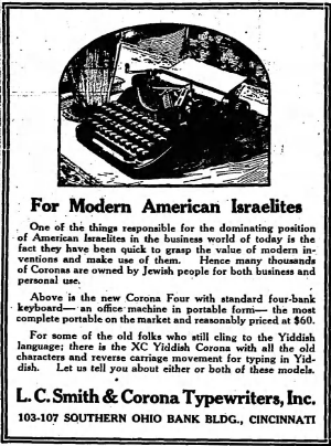 “For some of the old folks who still cling to the Yiddish language; there is the XC Yiddish Corona with all the old characters and reverse carriage movement for typing in Yiddish.”