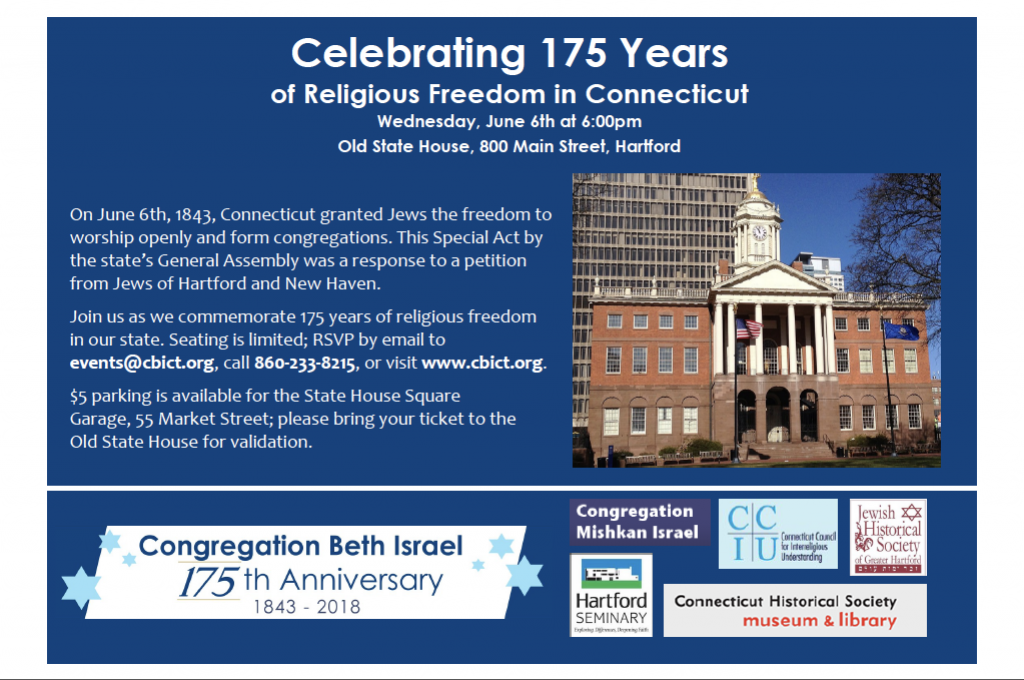 Join us as we commemorate 175 years of religious freedom in our state. Seating is limited; RSVP by email to events@cbict.org, call 860-233-8215, or visit www.cbict.org.